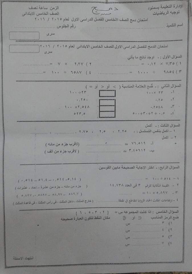 نماذج امتحانات الدمج فى كل مواد الصف الخامس الإبتدائى ترم أول